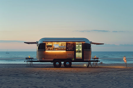 Trailer parked by the ocean with a view of the beach and horizon