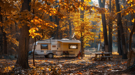 A white camper van is parked in a sunny autumn forest. The trees are all golden and the leaves are falling. There is a picnic table with a bench on the right side of the image.