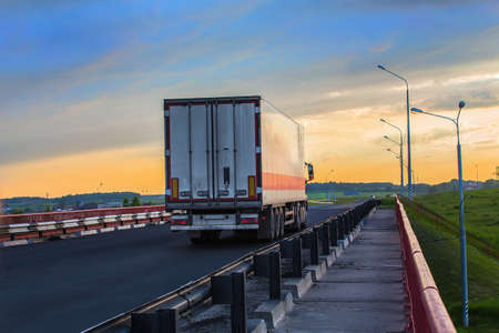 BOBRUISK, BELARUS 26.06.2019: The truck carries cargo on the highway in the evening against the night sky, trailer