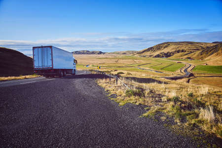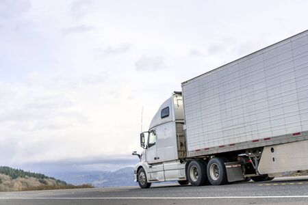 Truck white color on the highway, cloudy sky, closeup side view. USA countryside