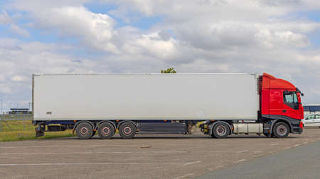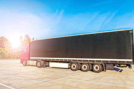 Truck in the parking lot. Truck stop near the highway. Large trailer for transportation of goods. Loader with red cab.