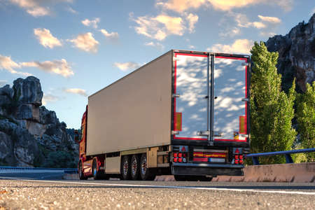 Semi-truck with cargo trailer driving on highway hauling goods in evening. Delivery transportation and logistics concept