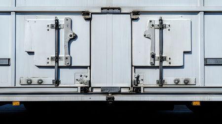A close-up of a freight truck's rear trailer, showing shipping container doors and safety locks as it's ready to transport goods over long distances.
