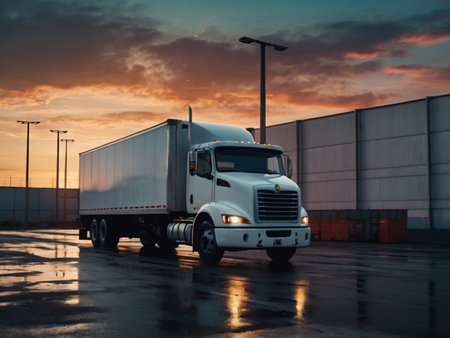 Embrace the tranquility of a trucking hub at sunset, featuring close-ups of truck wheels
