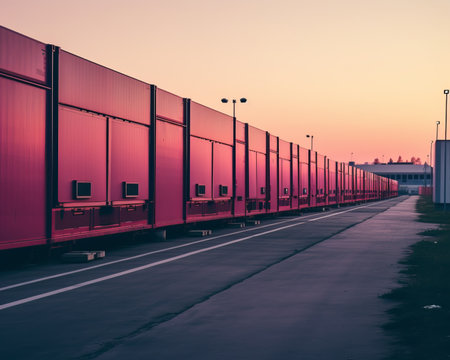 Early Morning Warehouse Operations with Delivery Trucks at Sunrise for Efficient Logistic Management