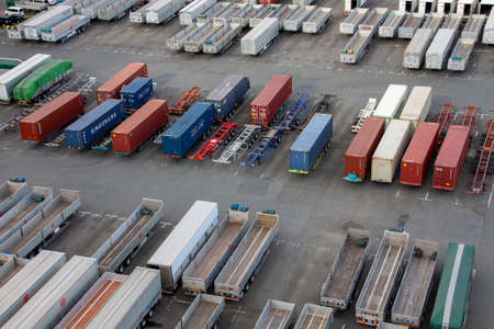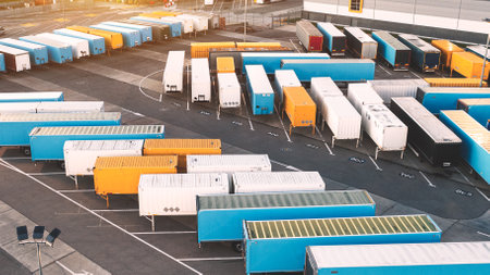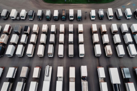 Many trucks and trailers are parked waiting to be loaded and unloaded. transportation of goods, aerial view of the car park