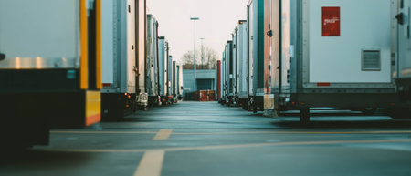 Delivery vans lined up for loading in a logistics area during the early morning hours