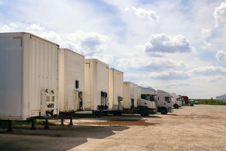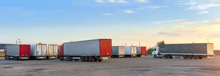 Trucks standing in a row. Trucks with trailers. Freight transportation.