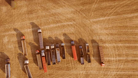 Aerial view of grain trucks on the field. Agricultural technique after wheat harvest. Agriculture and technology concept.