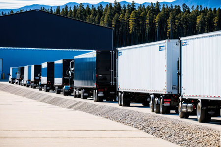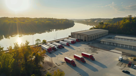 trucks align by the river next to a logistics warehouse, showcasing the seamless flow of goods and organized transport management