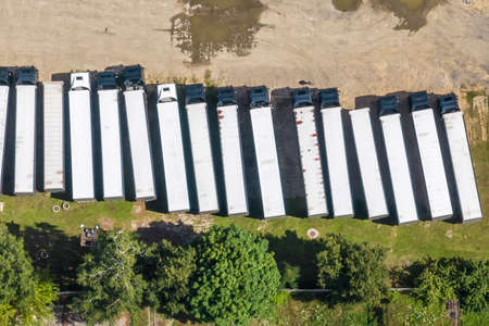 Aerial view from a drone of a parking lot with a multitude of trucks on a sunny day. Top view
