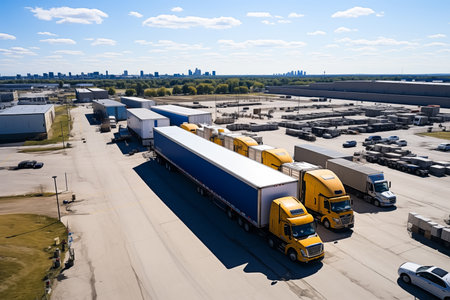 Semi Trucks in Warehouse during transportation on leading commodity. Photo of logistic from Aerial View.