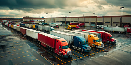commercial fleet-semi trucks and delivery vans neatly parked in rows, illustrating the efficiency of a well-managed supply chain