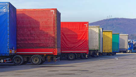 Heavy trucks loaded with goods trailers, parked in waiting area on state border crossing. International hard transportation and logistics. Transport infrastructure in evening at sunset