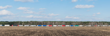Lorry trucks cars in traffic jam at border zone custom in checkpoint.