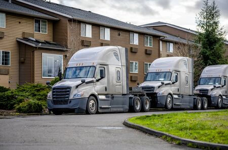 Big rig heavy-duty industrial gray semi truck tractor with diesel engine with eco soot filter towing other semi trucks tractors pulling them wit hitches standing on the motel parking lot for rest