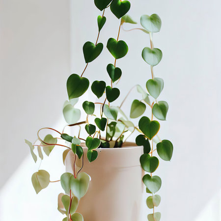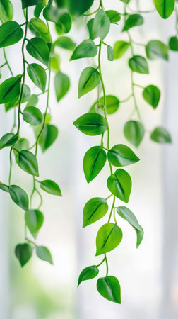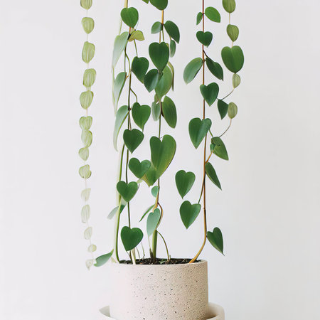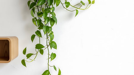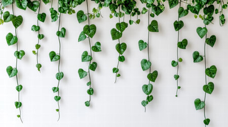 A captivating arrangement of green heart-shaped leaves gracefully hanging against a clean white wall. This image brings nature indoors, enhancing interior decor.