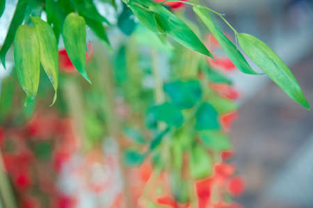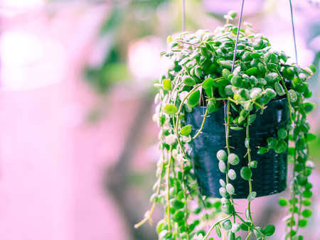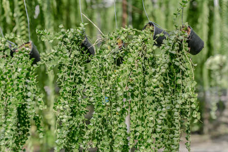 Hanging plants and Ivy grown in plastic pot hanging on the balcony and blurred background