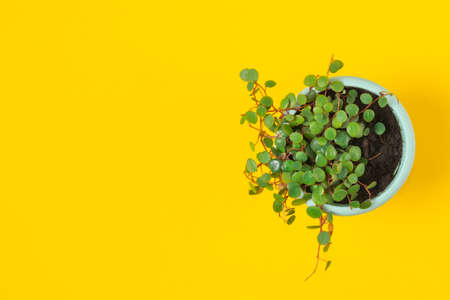 Peperomia pepperspot foliage. Peperomia in pot on yellow color background. small green plant. Botanical name is Peperomia pepperspot
