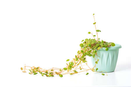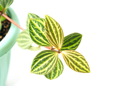 Green plant Peperomia Pepperspot on white background with copy space. home plant concept. Texture of flower leaves. tropical plants