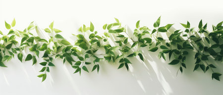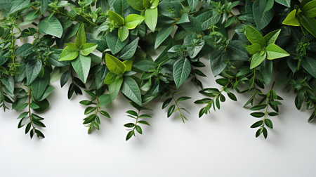 The green leaves lay on top of the white background. AI generated.