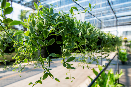 Green plants in pots in a greenhouse. Selective focus. Nature.