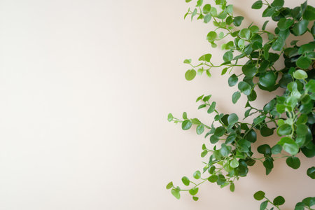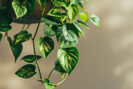 Vibrant green leaves of a plant cascading down a light neutral wall creating an inviting and fresh atmosphere in the space.
