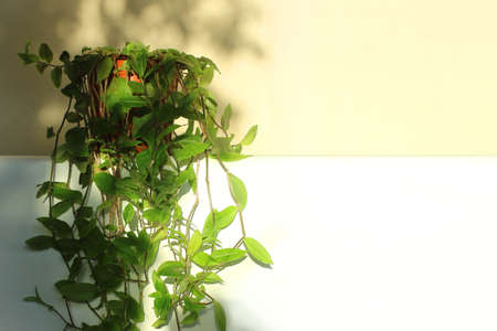 House plant hanging under sunlight on cement wall. Tropical rainforest garden, indoor and outdoor houseplant. Home decorative.