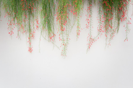 white wall background with firecracker plant or Russelia equisetiformis above