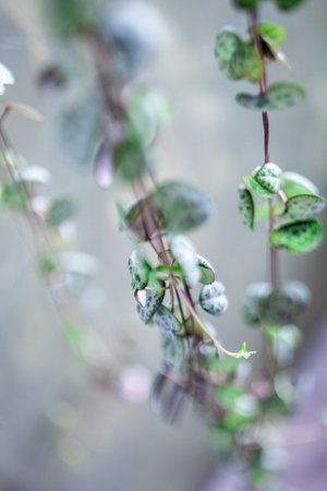 Flowering plant of ceropegia woodii also called chain of hearts or string of hearts on pink -green background, evergreen succulent plant with leaves shaped like heart