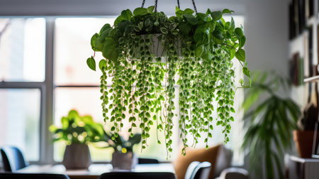 Vines with vibrant green leaves are beautifully cascading down, illuminated by soft sunlight filtering through a window. The atmosphere feels fresh and natural, enhancing the indoor space.