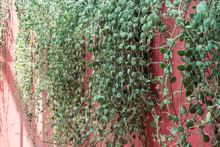 Climbing plants with round leaves against a red wall