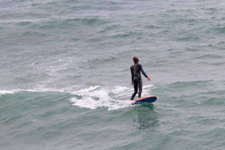 Surfer guy surfing with surfboard on waves in Atlantic ocean. Man in surfing wet suit is active surfing the waves of cold atlantic ocean in Galicia, Spain.