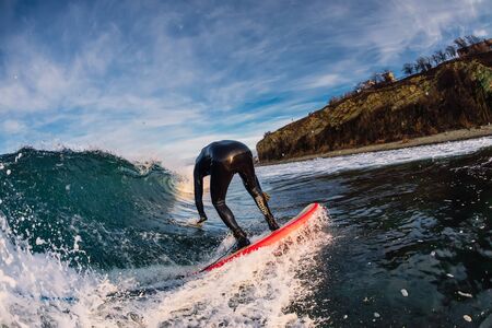Surfer on red surfboard ride on blue wave. Surfing in the ocean