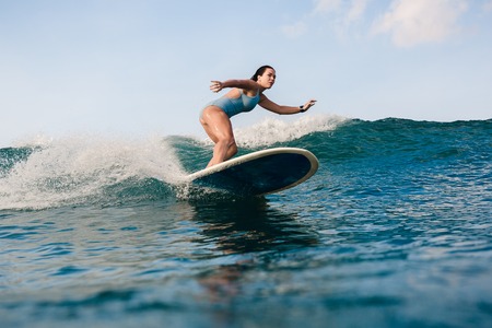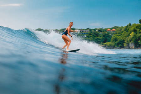Surfgirl at surfboard and perfect barrel wave. Sporty woman during surfing in Bali.