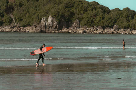 Mount Maunganui New Zealand - May 9 2020; Vintage effect surfer leaving water carrying orange surfboard.