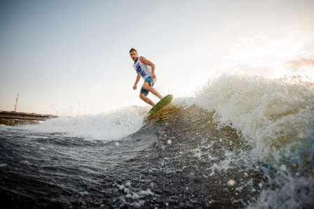 Active wakesurfer jumping on wake board down the river waves. Surfer on wave. Male athlete training on wakesurf training. Active water sports in open air on board. A man catches a wave on surf.