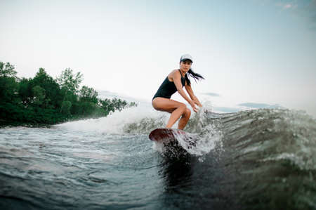 Young attractive brunette woman riding on the wakesurf on the bending knees on high wave of motorboat on the background of trees