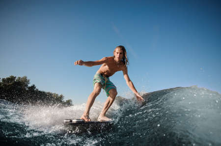 Young active brunet riding on the wakeboard on high wave of motorboat, having healthy summertime