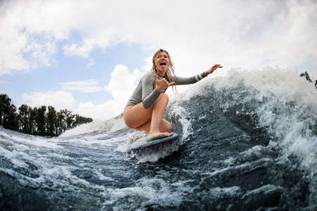 great view of smiling wet woman wakesurfer riding down the blue splashing wave