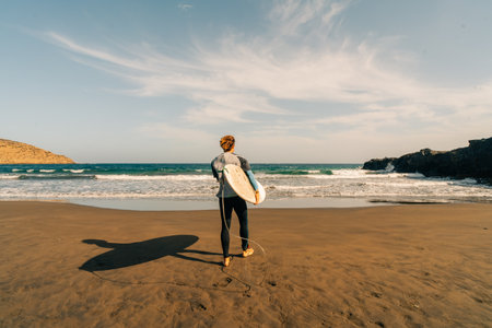 surfer man with surfboard in hand walking along the shore of the beach, surfboard on the beach at sunset, sand and water in the background