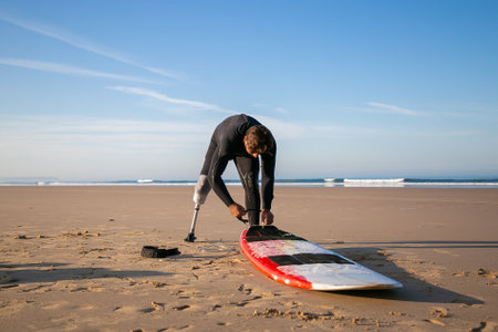 Surfer wearing wetsuit and artificial limb, tying board to his ankle on sand. Wide shot. Artificial limb and active lifestyle concept