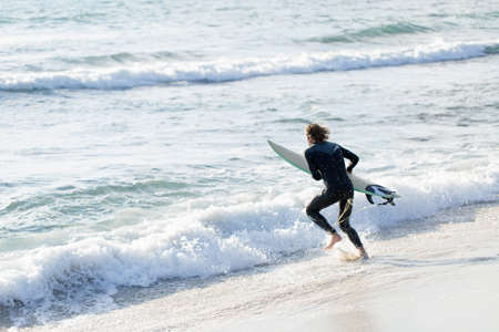 Front view of young mixed-race male surfer running on the beach with his surfboard