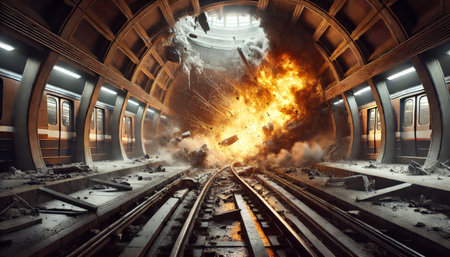 A traffic accident on the railway. the collision of two passenger trains. The scene is dark and ominous, and the wreckage of the train and the destruction of the bridge create a sense of danger and chaos