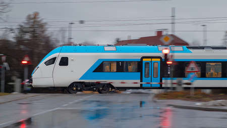 Side view of modern electric passenger train during cold winter rain is rushing through a grade crossing with road with barriers down and red signals flashing