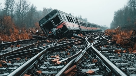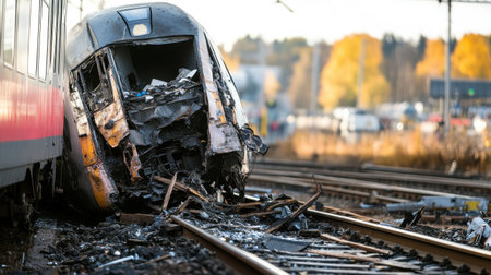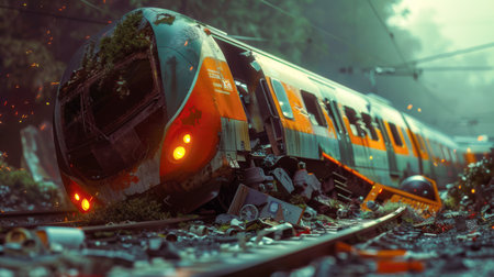 diesel locomotive derailed, careening off the tracks and colliding with a barrier some distance away, causing significant damage.AI Generated