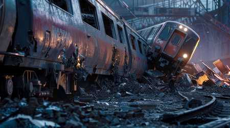 Generative AI : Massive train derail Dramatic night scene of a headon collision between two trains in the night