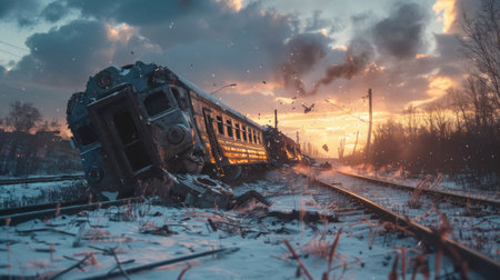 As the sun sets, a train derailment leaves twisted metal and debris scattered along the tracks.