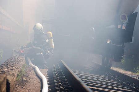 Firefighters are extinguishing chemical cargo train tanks near Sofia. Teams from Fire department are participating in an emergency training with spilled toxic and flammable materials.
