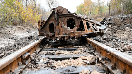 A severely damaged and rusted train carriage lies overturned on a set of broken railway tracks, surrounded by debris and a desolate landscape.